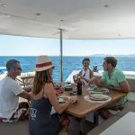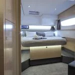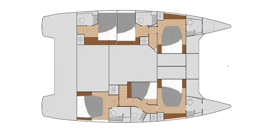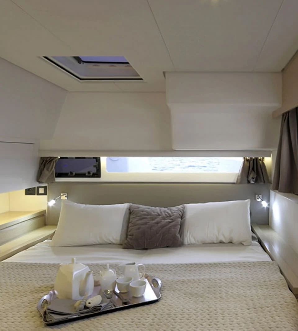Ce catamaran peut accueillir jusqu’à 14 personnes dans ses 6 cabines doubles et ses deux couchettes dans les pointes.
